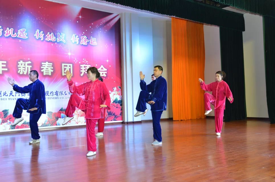 時而白鶴亮翅,時而手揮琵琶,時而如封如閉。在舒緩、輕柔的音樂聲中,由汪枝秀、沈彩虹、楊金仙、于少波、龔振軍、劉學斌表演的太極徐徐展開。他們都是太極愛好者,因為太極走到了一起,既強健了身體,也愉悅了身心,更增進了彼此的了解。員工們欣賞著他們靈動的身姿,沉浸在美妙的音樂中,享受著難得的一刻輕松愜意。
