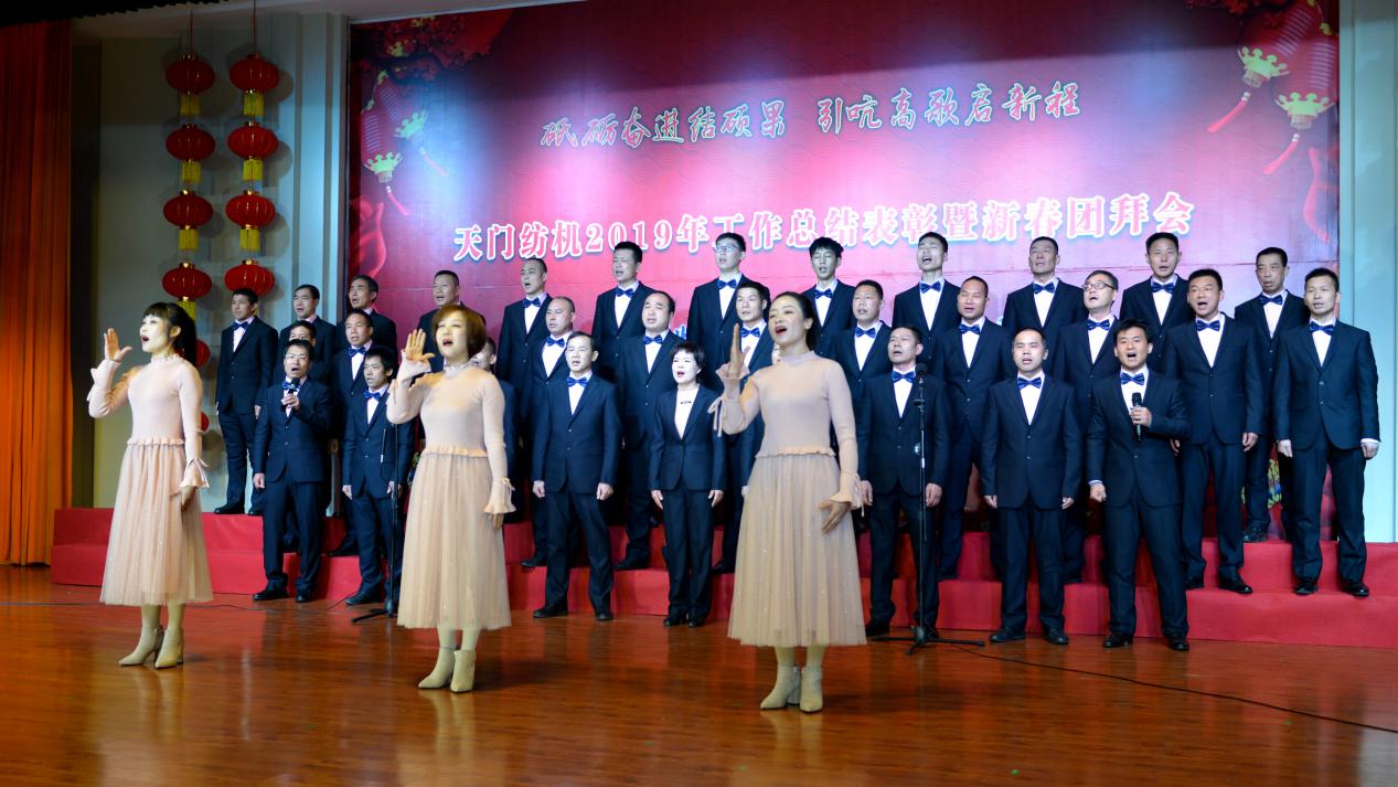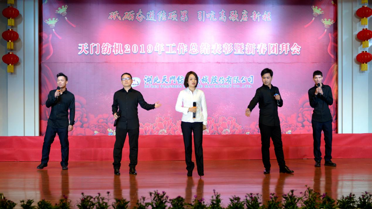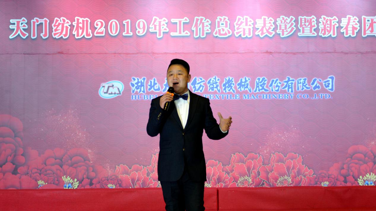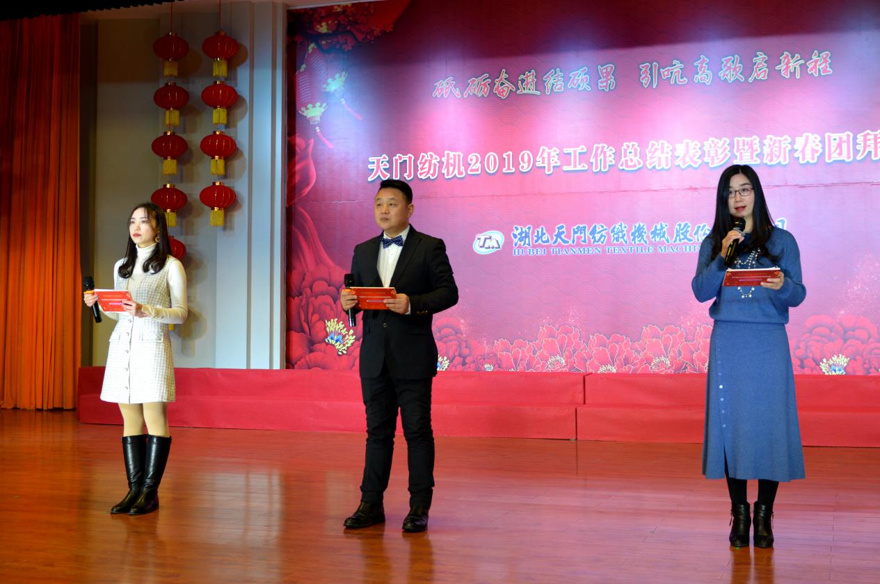 2020年1月21日下午,湖北天門紡織機械股份有限公司綜合樓多功能廳張燈結(jié)彩、暖流融融,一場主題為“砥礪奮進結(jié)碩果、引吭高歌啟新程”的年度總結(jié)表彰暨新春團拜會在這里舉行,400多名員工身著公司新佩發(fā)的西服套裝,精神奕奕地走進會場。13:00整,三位主持人靚妝登場,宣布2019年度總結(jié)表彰暨新春團拜會開始。