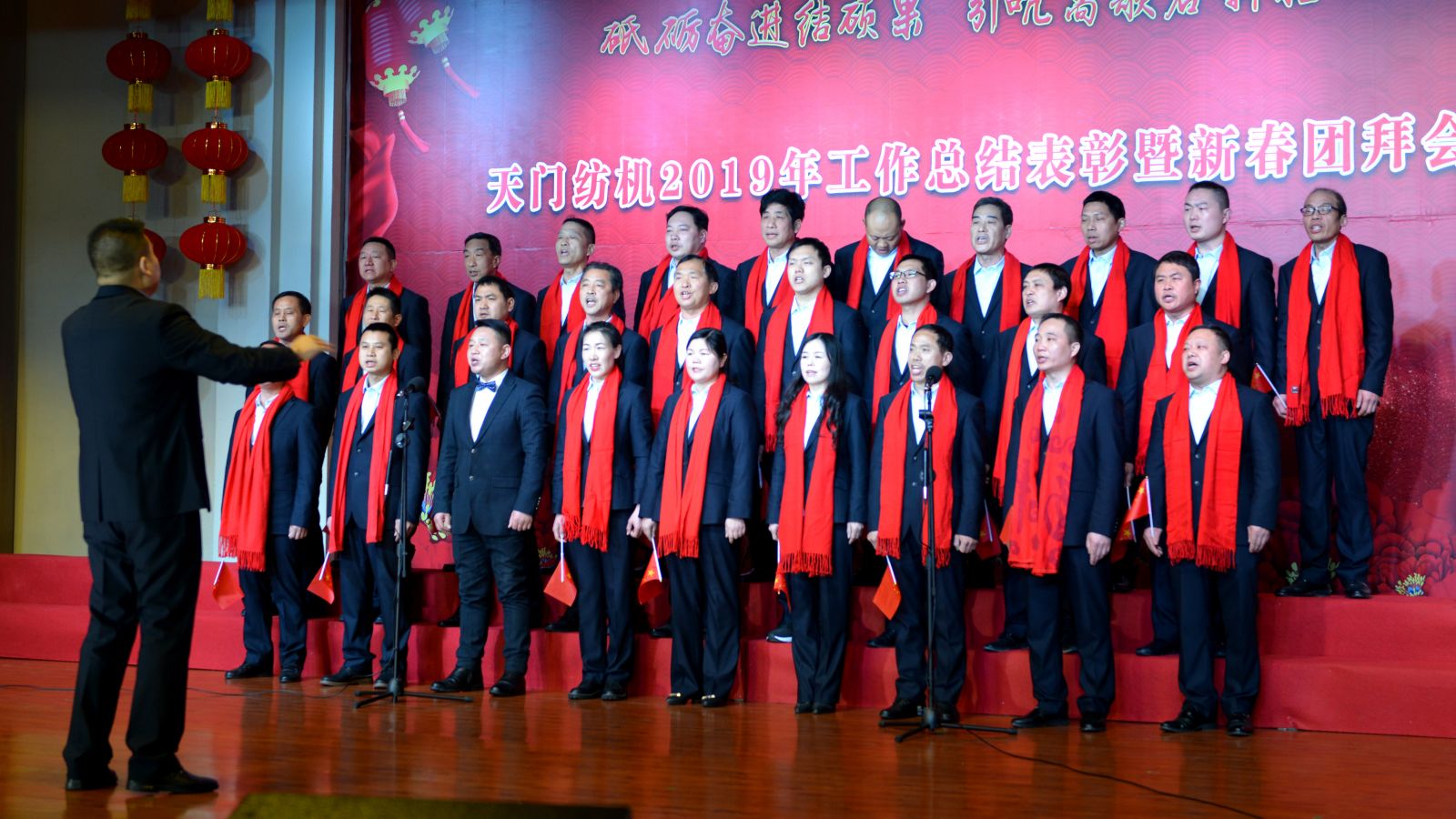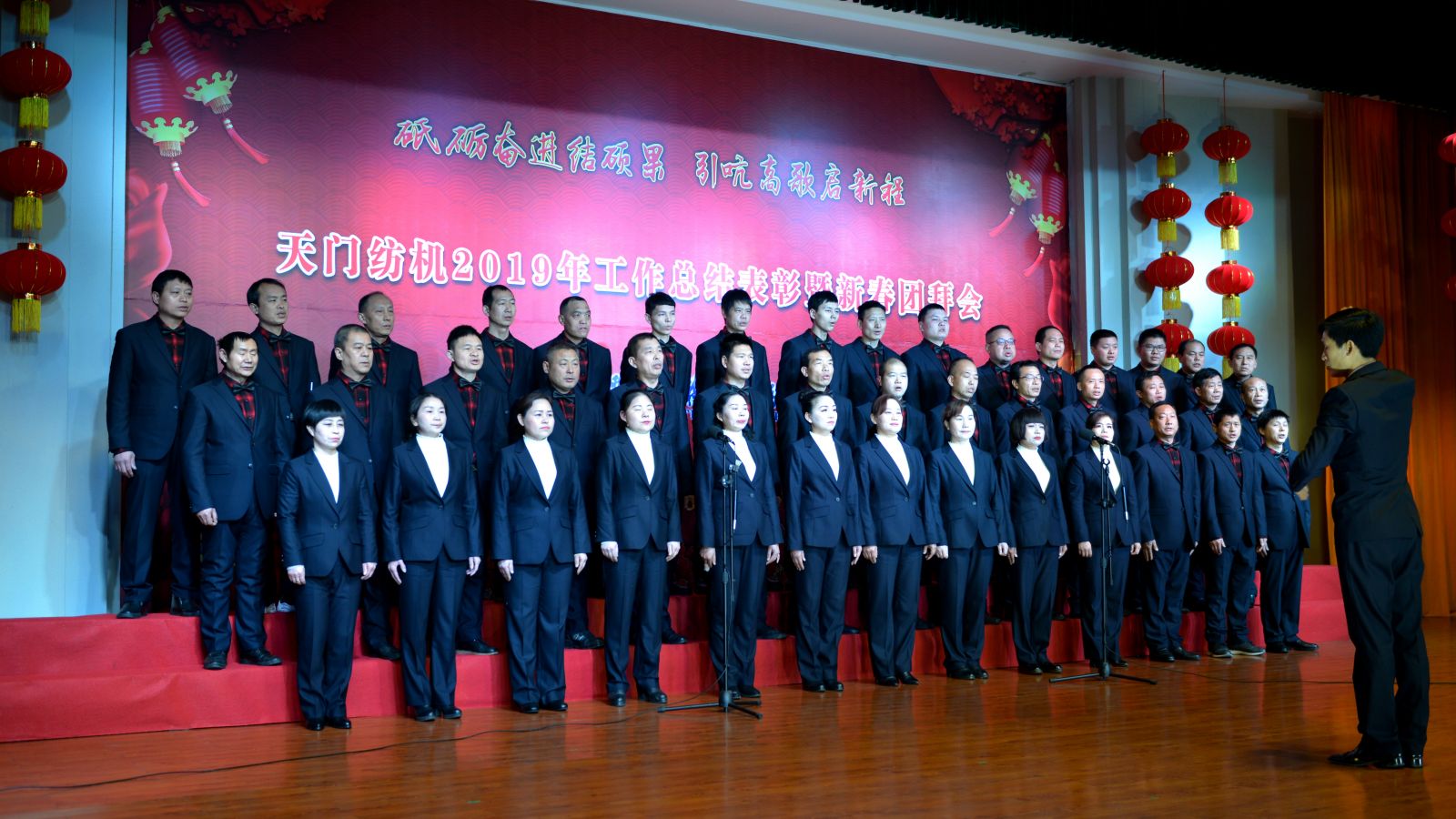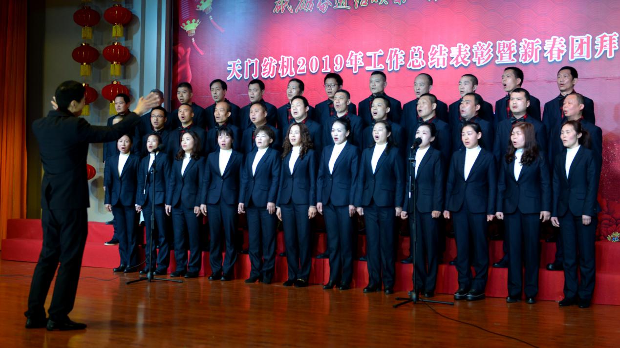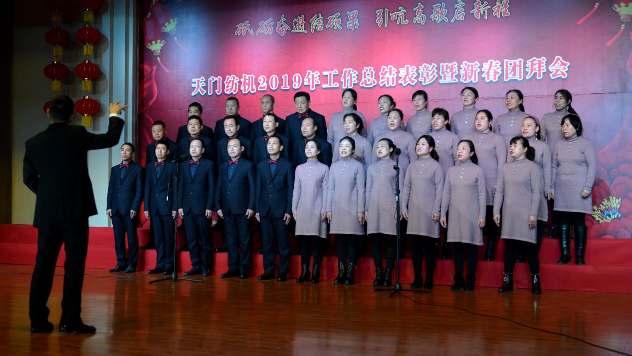 2020年1月21日下午,湖北天門紡織機械股份有限公司綜合樓多功能廳張燈結(jié)彩、暖流融融,一場主題為“砥礪奮進結(jié)碩果、引吭高歌啟新程”的年度總結(jié)表彰暨新春團拜會在這里舉行,400多名員工身著公司新佩發(fā)的西服套裝,精神奕奕地走進會場。13:00整,三位主持人靚妝登場,宣布2019年度總結(jié)表彰暨新春團拜會開始。
