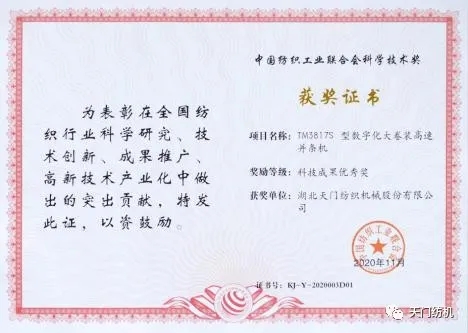 TM3817S型并條機(jī)獲評(píng)2020年度中國紡織工業(yè)聯(lián)合會(huì)“科技成果優(yōu)秀獎(jiǎng)”