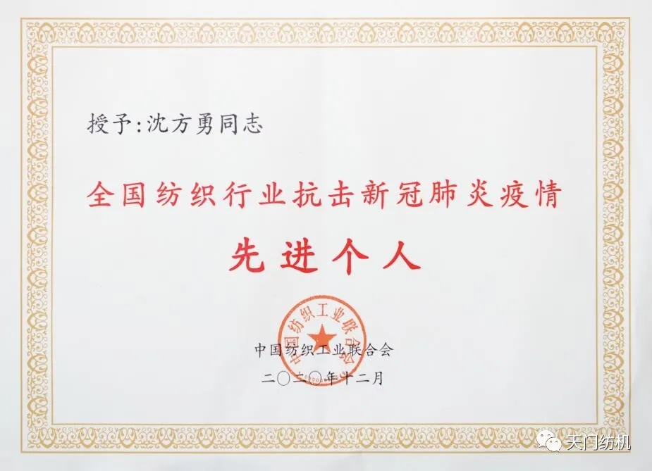 國家衛(wèi)建委、湖北省、天門市共11次檢查指導(dǎo)防疫工作,給予高度好評(píng)。國家衛(wèi)健委副主任于學(xué)軍評(píng)價(jià)天門紡機(jī)防疫有預(yù)案、有演練、有實(shí)踐,對(duì)企業(yè)抓防疫、保復(fù)產(chǎn)、促就業(yè)給予了充分肯定。9月,董事長獲評(píng)“全國紡織行業(yè)抗擊新冠肺炎疫情先進(jìn)個(gè)人”、天門市“抗擊新冠肺炎疫情先進(jìn)個(gè)人”,代表公司在疫情的大考中獲得時(shí)代新榮譽(yù)。