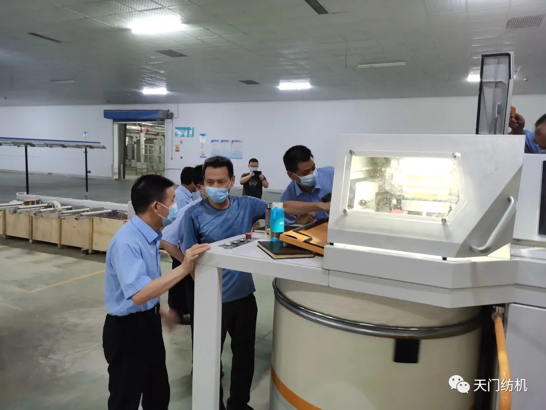 天門(mén)紡機(jī)“全球首款超大卷裝雙眼高速自調(diào)勻整并條機(jī)”—TM19自6月份上海展會(huì)首次亮相后,已布點(diǎn)在不同客戶處并線試紡3月有余。為了解該機(jī)并線后的真實(shí)使用情況,9月18日,天門(mén)紡機(jī)董事長(zhǎng)沈方勇、總經(jīng)理焦倫進(jìn)帶領(lǐng)技術(shù)研發(fā)人員組成的TM19評(píng)估組,專程赴卓爾天龍紡織公司,現(xiàn)場(chǎng)考察實(shí)際使用情況,征求客戶意見(jiàn)建議。