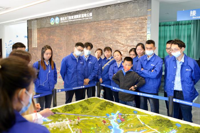 公司全體青年員工坐乘大巴車來到了張家湖國家濕地公園,它位于湖北省天門市九真鎮(zhèn),湖泊水域面積6.53平方公里,平均水深1.8米,是典型的淺水湖泊,其濕地類型屬內(nèi)陸淡水湖泊,是天門市最大的湖泊,也是湖北省保持原始生態(tài)最好的湖泊之一。到上世紀二十年代,隨著湖區(qū)淤積、湖泊萎縮,西部形成張家湖,東部形成石家湖。到達目的地后,公園的工作人員進行了熱情地接待,大家仿佛穿越到了原生態(tài)的農(nóng)耕時代,湖泊密布,半島羅列,河湖相通,一派水鄉(xiāng)澤國、湖光田園景象。來到觀鳥臺,登高望遠,一覽張家湖美景和各種野生鳥類。公園設(shè)有科普館,里面陳列了濕地的人文風(fēng)貌及天門的特色文化,還有各種攝影大片。