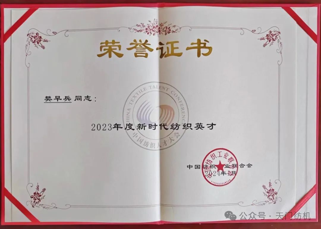 2024年1月16日,樊早兵同志在全國(guó)人大會(huì)議中心參加“2023年中國(guó)紡織人才大會(huì)”,受到中紡聯(lián)表彰,獲得“2023年度新時(shí)代紡織英才”獎(jiǎng)牌和榮譽(yù)證書。