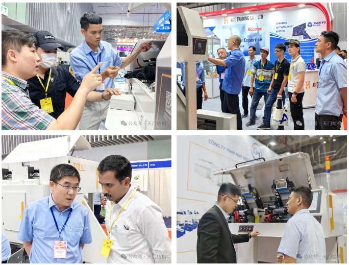 越南展會(huì)現(xiàn)場(chǎng)人流如織,其中天門(mén)紡機(jī)展區(qū)尤為矚目,開(kāi)展期間分別迎來(lái)HANO SIMEX、VICOTEX、HONG LINH、NHA TRANG、THANG CONG、PHU BAI等50余家越南紡企的到訪,T1系列并條機(jī)憑借卓越性能表現(xiàn),引發(fā)現(xiàn)場(chǎng)觀眾駐足,多位老客戶(hù)對(duì)T1系列并條機(jī)的穩(wěn)定性與高效產(chǎn)能給予高度評(píng)價(jià)。
